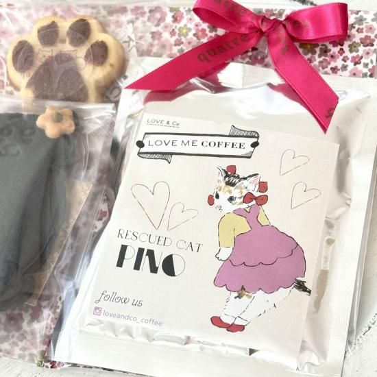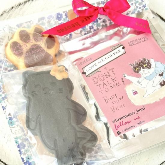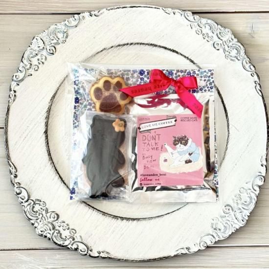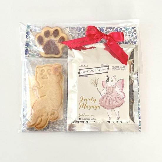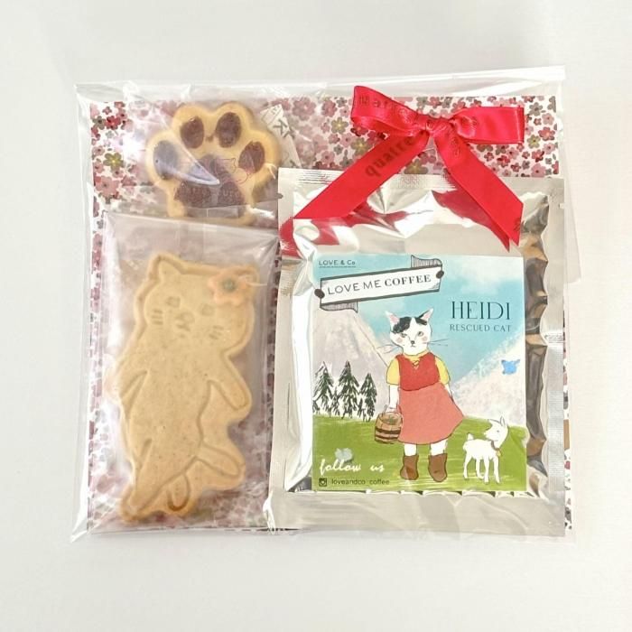黒猫と黒犬のクッキー、肉球マドレーヌ、そしてLOVE&Co.CATSがモデルを務めるドリップコーヒーを詰め込んだ、癒しのギフトセットです。